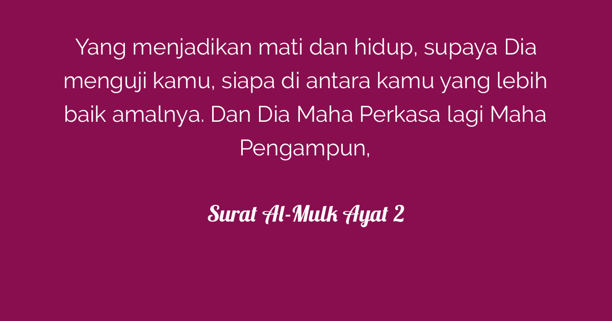 That is, the object of giving life to man. Nuthfah pada asalnya sebagai barang mati, kemudian jadilah ia hi. اۨلَّذِىۡ خَلَقَ الۡمَوۡتَ وَالۡحَيٰوةَ لِيَبۡلُوَكُمۡ اَيُّكُمۡ اَحۡسَنُ عَمَلًا ؕ وَهُوَ الۡعَزِيۡزُ الۡغَفُوۡرُۙ ﴿67:2﴾. الَّذِي خَلَقَ الْمَوْتَ وَالْحَيَاةَ لِيَبْلُوَكُمْ أَيُّكُمْ أَحْسَنُ عَمَلا وَهُوَ الْعَزِيزُ الْغَفُورُ yang menjadikan mati dan hidup, supaya dia menguji kamu, siapa di antara kamu yang lebih baik amalnya. Al mulk artinya kerajaan, surat al mulk ini adalah surat ke 67 dalam al quran.